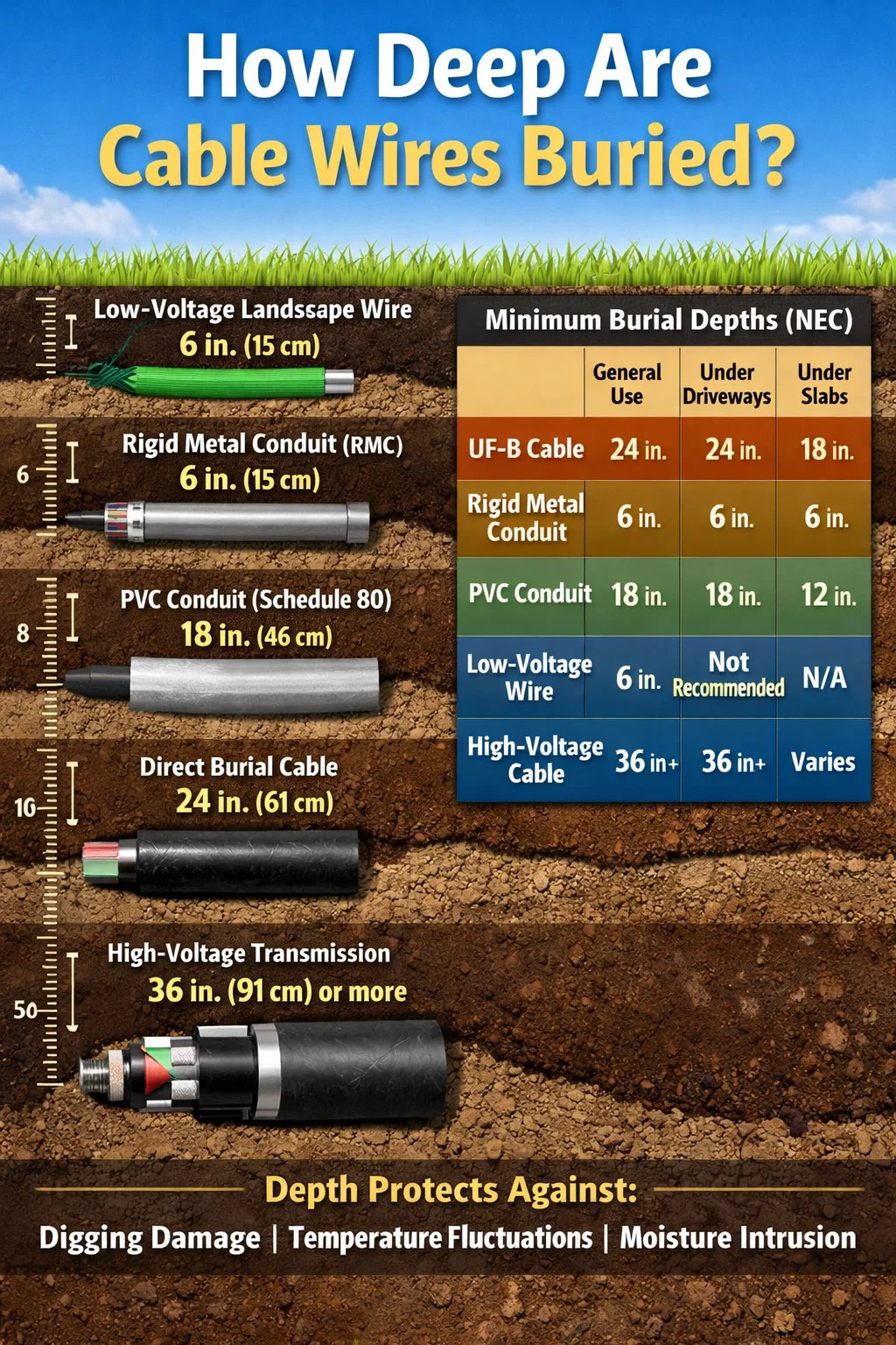 ケーブル ワイヤは、次の範囲の深さに埋設されています。 6 インチ (15 cm) ~ 36 インチ (91 cm) ケーブルのタイプ、アプリケーション、電圧レベル、およびローカル コードの要件に応じて異なります。住宅環境では、低電圧の景観配線が地表からわずか 6 インチ下に設置される場合がありますが、高電圧送電線は 36 インチ以上の深さに設置することができます。米国電気工事規程 (NEC) は、ケーブルの種類や設置環境によって大きく異なる最小埋設深さを定めています。