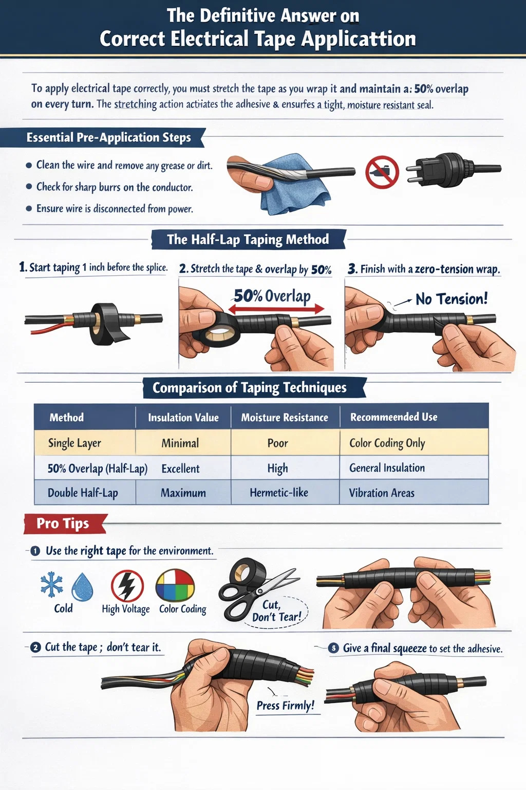 テーピングのゴールドスタンダードは「半周」です。これは、テープの後続の各ターンが前のターンのちょうど半分をカバーすることを意味します。これは単なる提案ではありません。これは電気的完全性のための構造上の要件です。