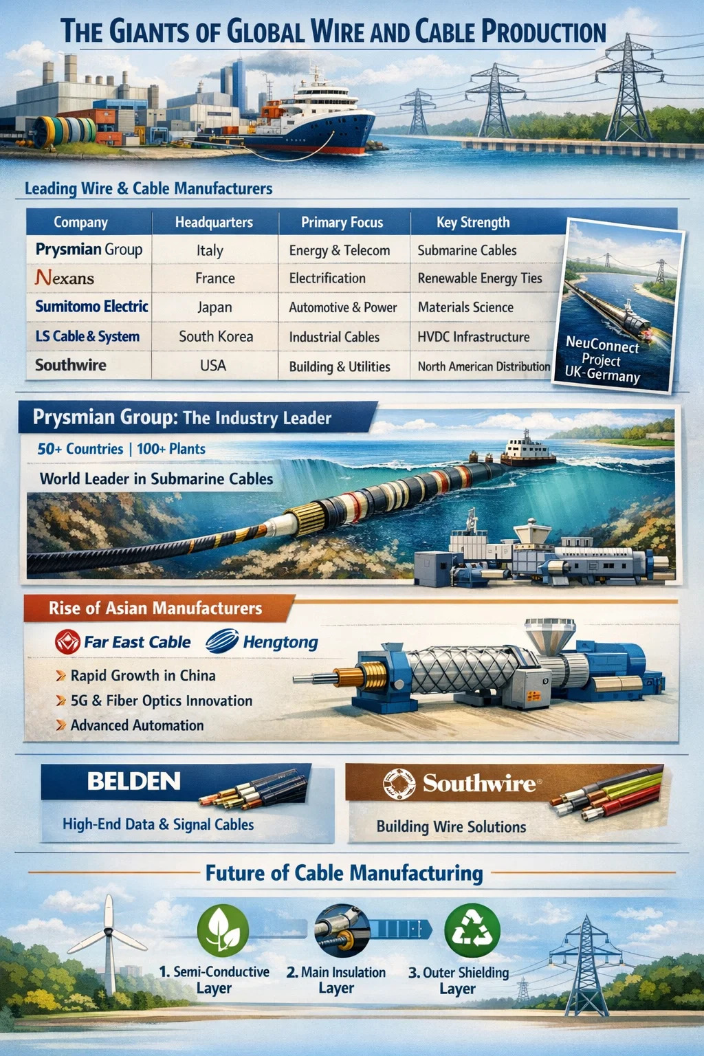 これらのメーカーの規模を理解するには、年間売上高と特殊な市場セグメントに注目することが役立ちます。これらの企業は家庭用配線を製造しているだけではありません。彼らは、大陸をつなぐ巨大な海底ケーブルと都市全体に電力を供給する高圧線を担当しています。