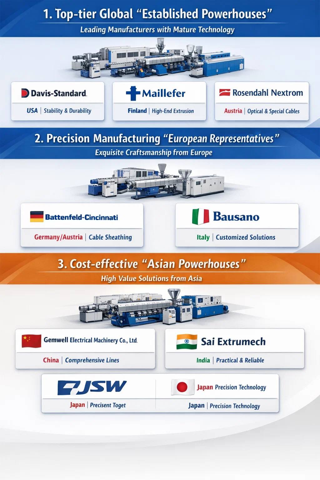 ワイヤーおよびケーブル業界には、多数のメーカーが存在します。 ワイヤーおよびケーブル押出機 。メーカーの規模、技術的専門知識、世界市場での評判に基づいて、これらのメーカーはいくつかの「階層」に大別できます。